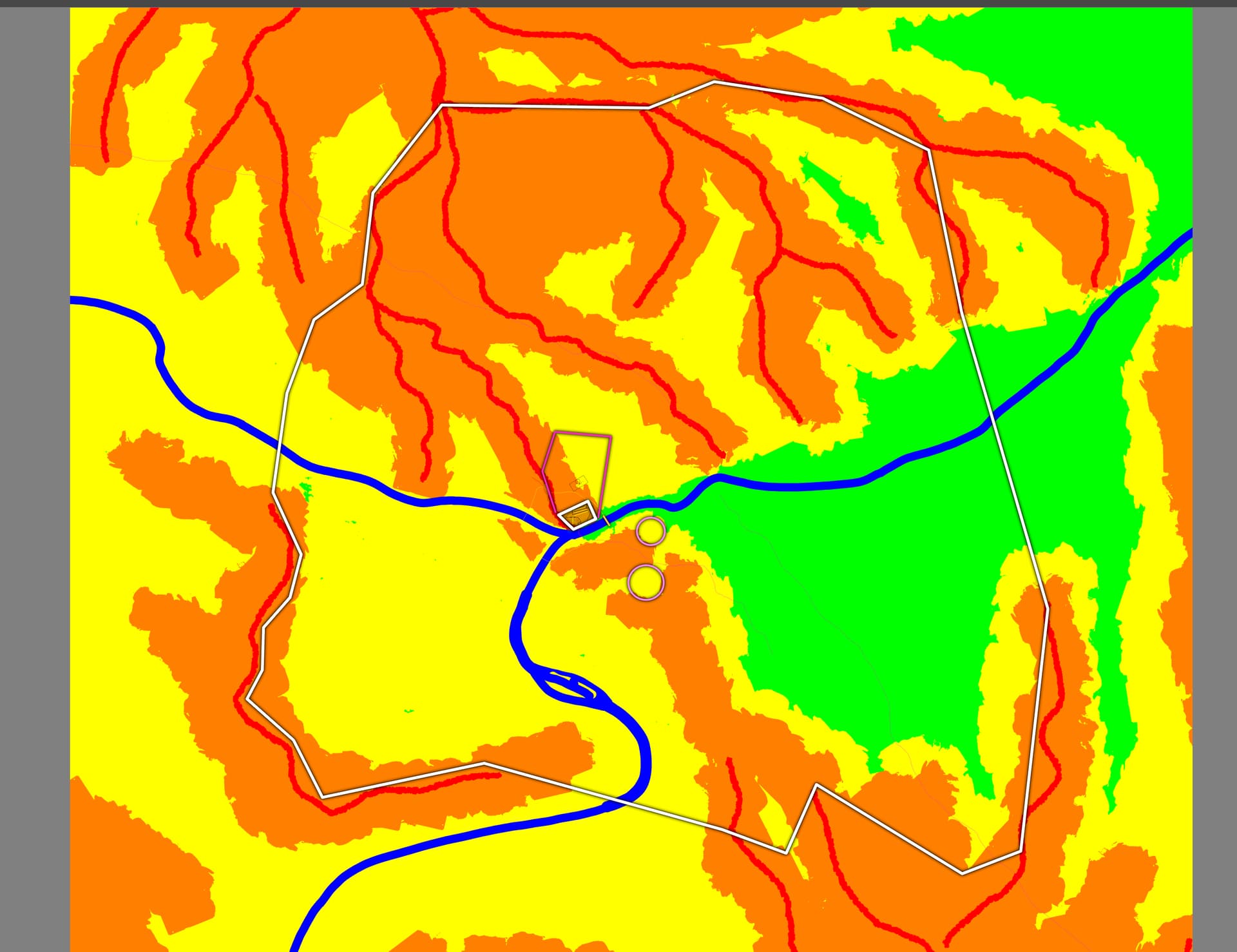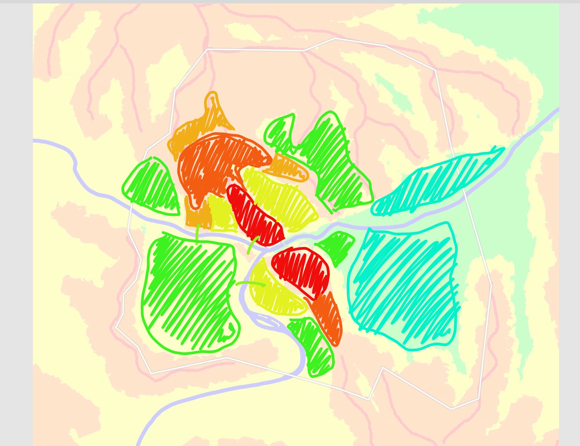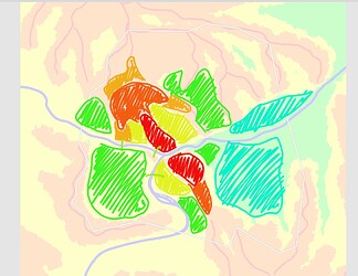 Obszar mapy jest szeroki na 10km. Na tej mapie wszystko jest umowne, traktujcie ją jak szkic. To nie jest prawdziwa hipsometria. Czerwień to linie grani łączące szczyty, a nie określona wysokość. Pozostałe kolory też są raczej po to, by wskazać kierunki spadku terenu, niż jako bezwzględne cokolwiek. Biały czworokąt w centrum to zachowany przez wieki zamek, przy nim jest dzielnica z budynkami parlamentu, ministerstw itp., a także główny historyczny most. Po drugiej stronie rzeki kółkami są zaznaczone potencjalnie sensowne miejsca na rynki, miejską administrację, cokolwiek w tym stylu. Orientacyjnie na biało zaznaczyłem zasięg miasta, przynajmniej tej porządniejszej części.
