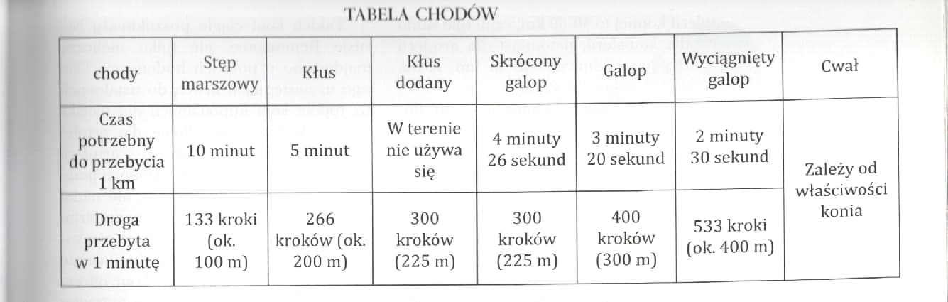 Do orientacyjnego określania ile czasu zajmuje przemarsz jakim chodem może się przydać tabela chodów (skan z s. 21 tomu 54 Wielkiej Księgi Kawalerii Polskiej):
