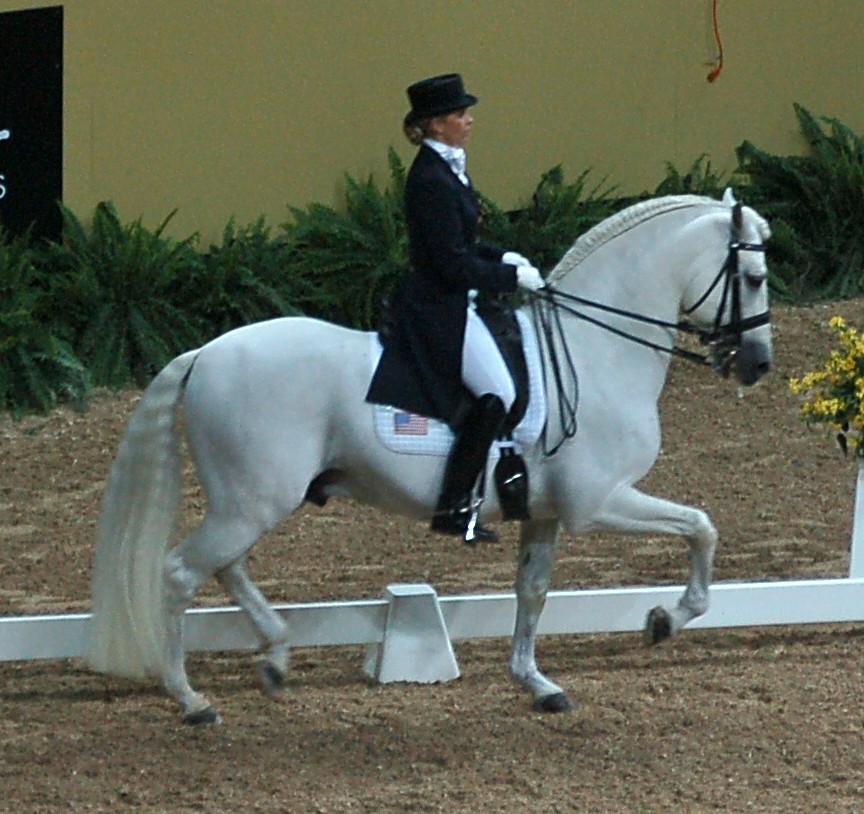 Przykład dosiadu w ujeżdżeniu - długie strzemiona stabilizują jeźdźca w siodle, przylegająca do boków łydka pozwala na dokładne kierowanie ruchami wierzchowca.