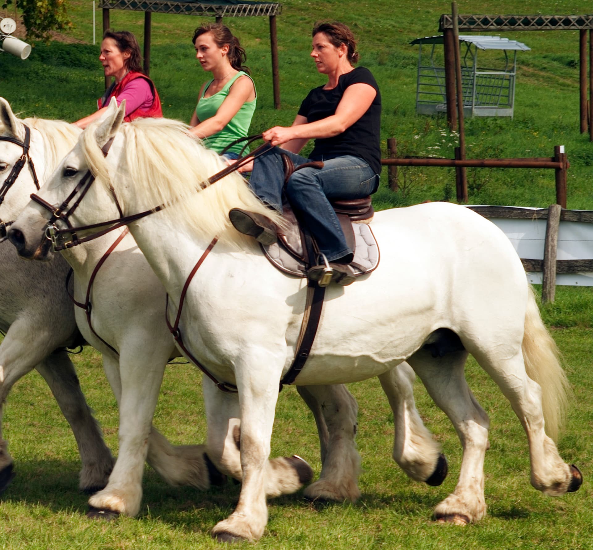 Kombinacja tych dwóch potrzeb zaowocowała postawą bardzo przypominającą postawę na oklep - ze stosunkowo długimi strzemionami ale bez sztucznego prostowania nogi i nadmiernego zapierania się w strzemieniu, często z nogą lekko przesuniętą do przodu. Widać ją zarówno u Gardianów z Camargue, jak i u wielu jeźdźców westernowych, gdzie dodatkowo w zależności od dyscypliny sportowej są albo wyprostowani w siodle, albo lekko się garbią, by móc w ten sposób dostosować się do nagłych zwrotów konia.