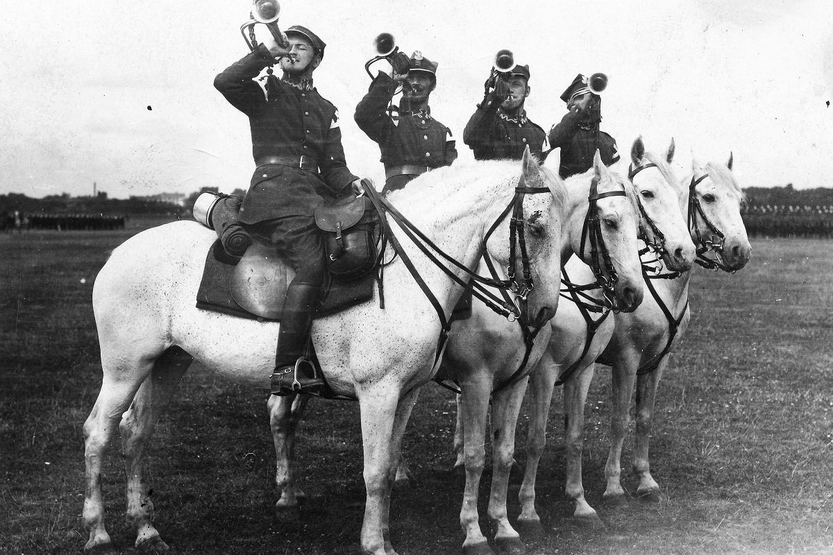 Zdjęcie trębaczy ułanów z 1924r. Były to uroczystości, więc możemy uznać, że jest to “pokazowa” postawa i widać, że kolana są zgięte.