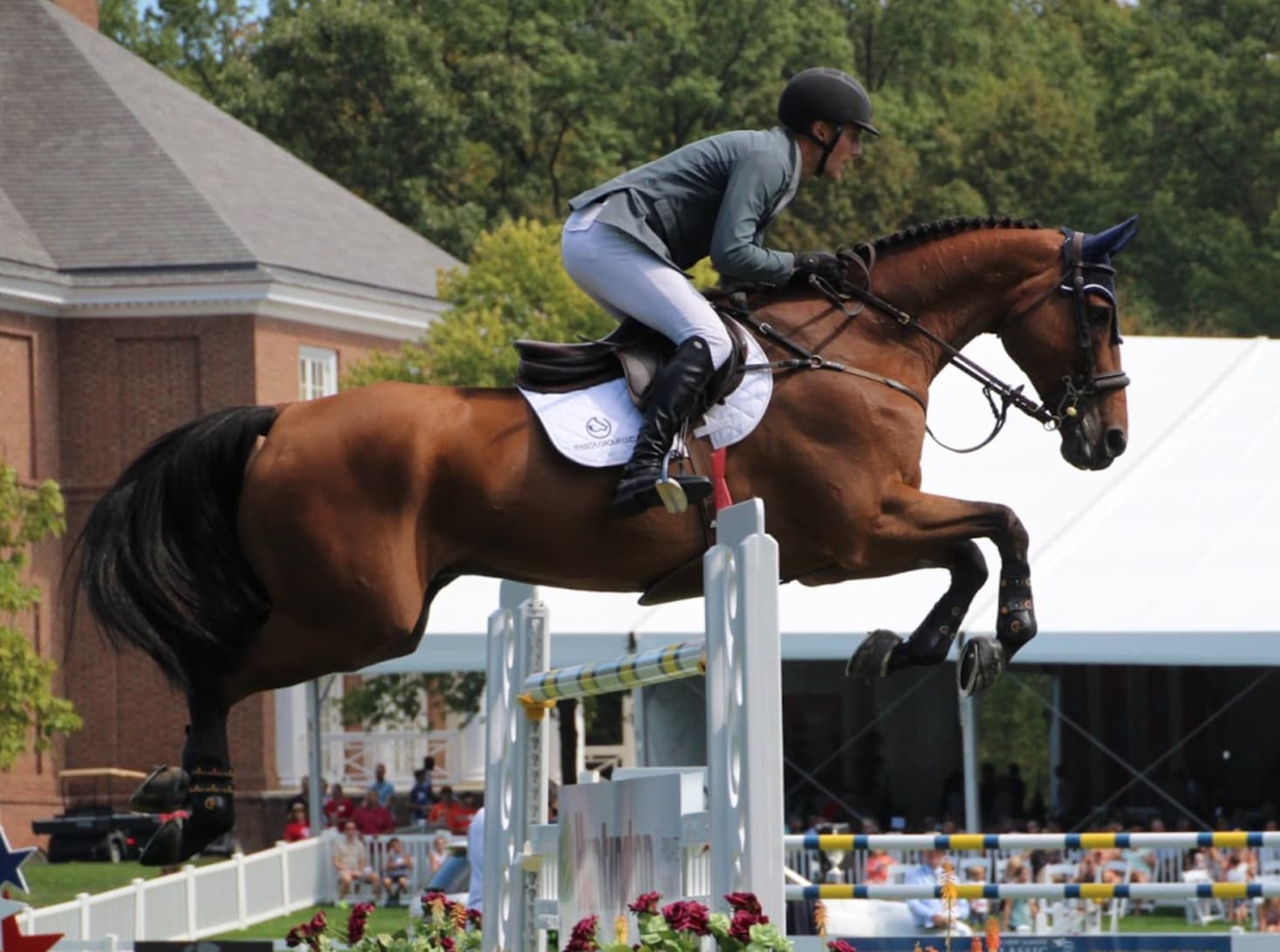 Przykład współczesnej postawy skokowej - krótkie strzemiona umożliwiają wysokie podniesienie się z siodła nad przeszkodą.