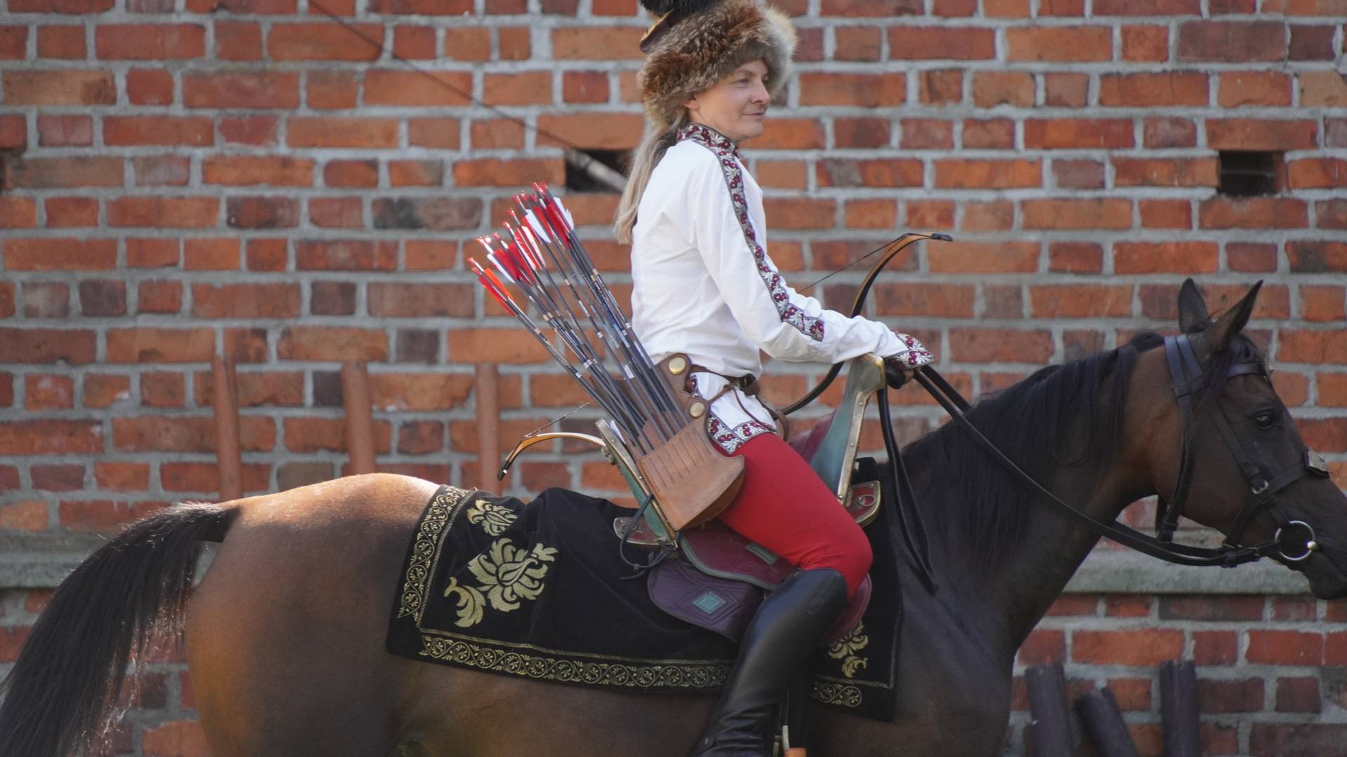 Współcześni odtwórcy i zawodnicy łucznictwa konnego nieraz także mają mocno skrócone strzemiona (na zdjęciu Anna Sokólska, utytułowana międzynarodowo zawodniczka łucznictwa konnego)