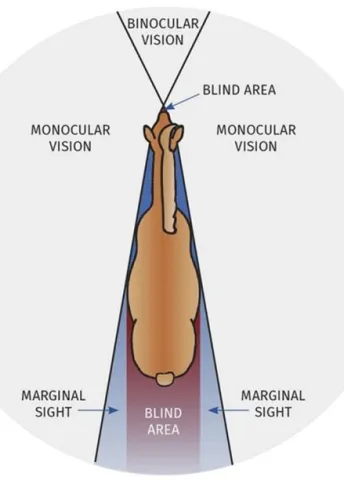 Większość pola widzenia konia to wizja monokularna - czyli widoczna pojedynczym okiem. W obszarze wizji monokularnej, konie nie są w stanie ocenić objętości obiektów i dystansu. Wizja binokularna konia, która pozwala na dokładniejsze, trójwymiarowe widzenie to ok. 60 stopni z przodu, gdzie pole widzenia obydwu oczu nachodzi na siebie.