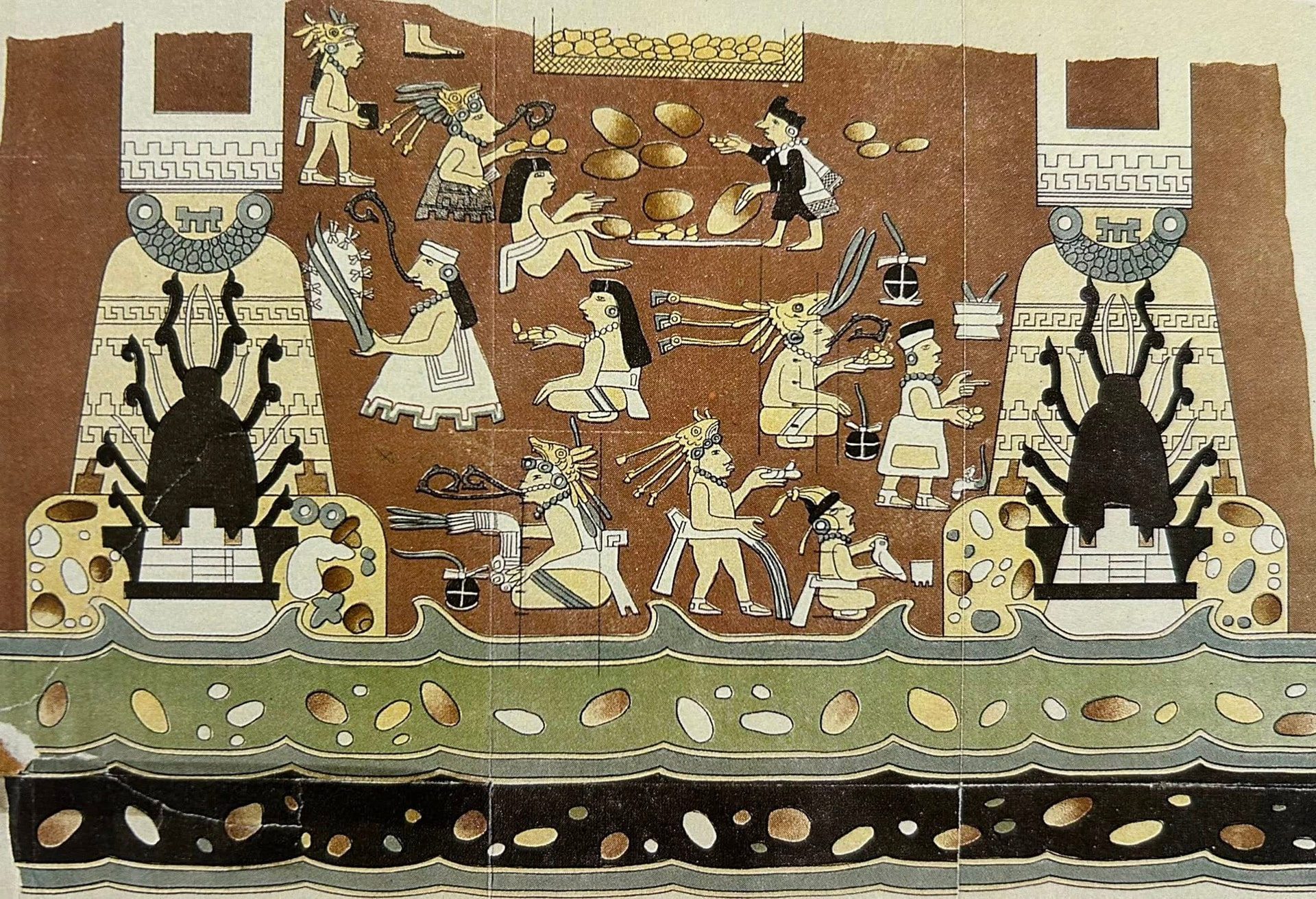 ![Mural znaleziony na stanowisku Niyar-4 w obiekcie AP-17. Dobrze widoczny przekrój społeczeństwa, choć głównie przedstawieni są mnisi. Jest nawet kapłan-ptasiarz. Wejścia do obu klasztorów mają formę stylizowanego krocionoga. W podobnej stylistyce ludność ta wykonywała także zaskakująco szczegółowe mapy regionu. [Irl źródło: mural w Teōtīhuacān]](https://forum.swiatotworzenie.pl/uploads/default/optimized/2X/f/f0f63d06e0e63be653b97997016bf660c4880216_2_690x471.jpeg)