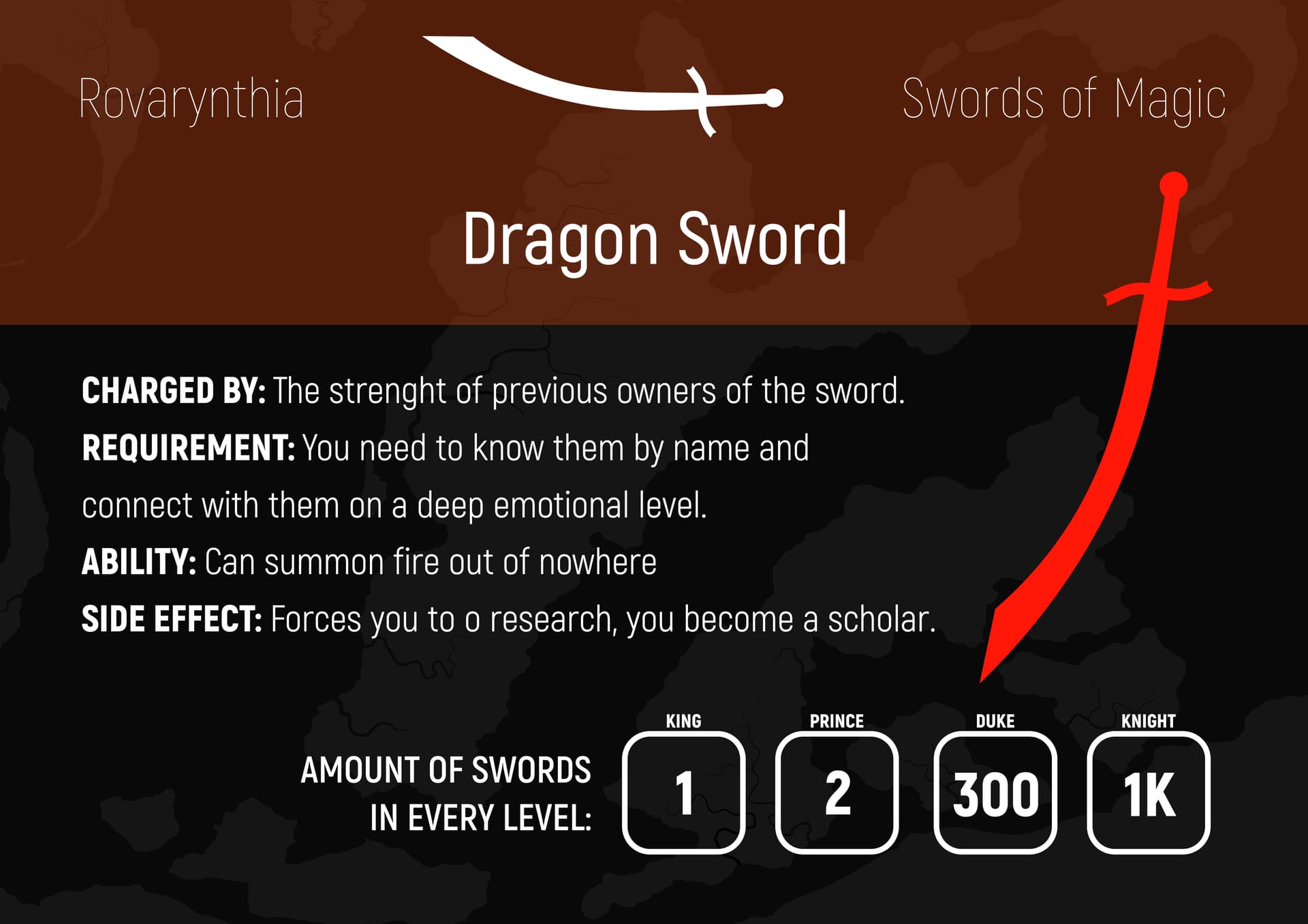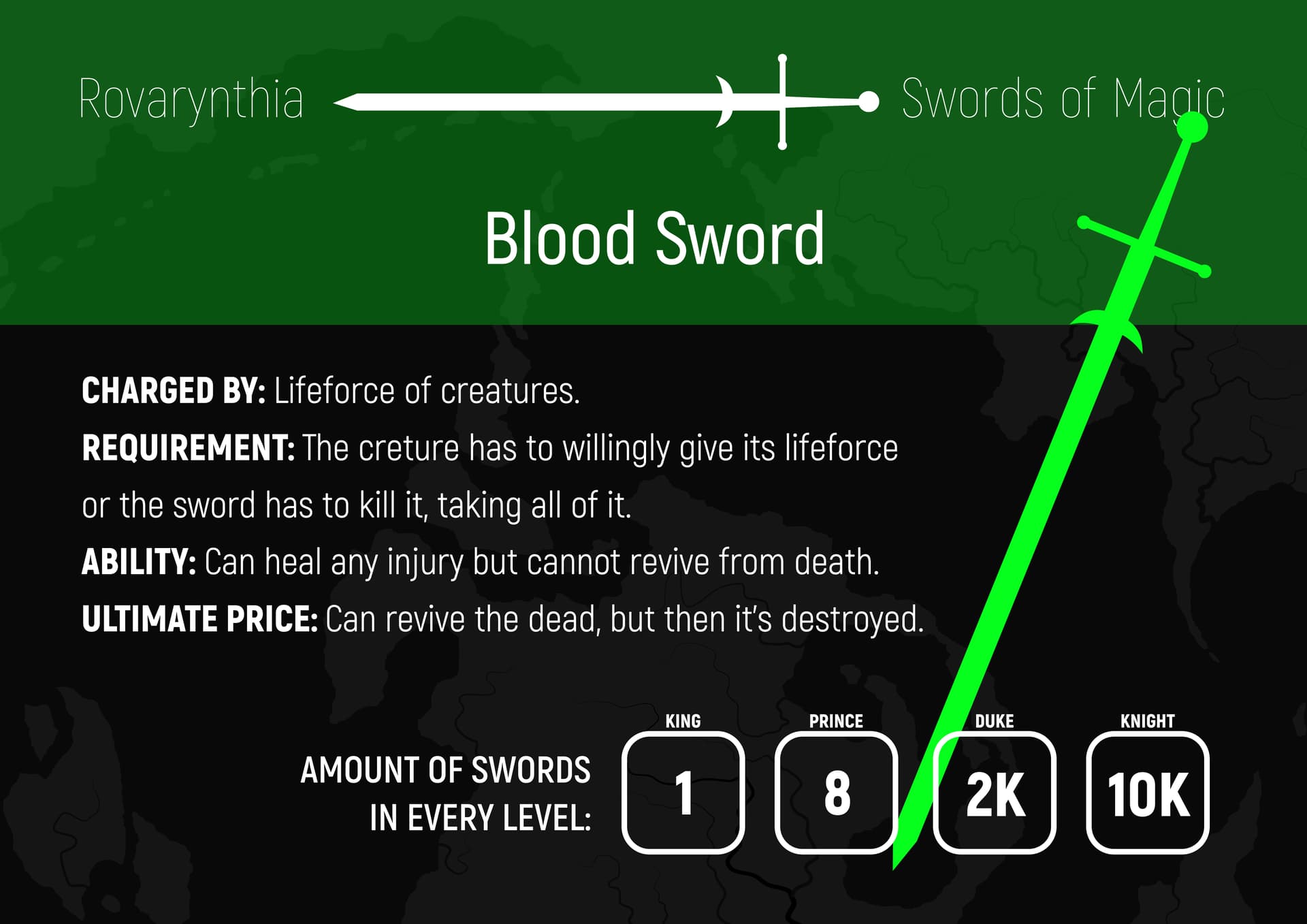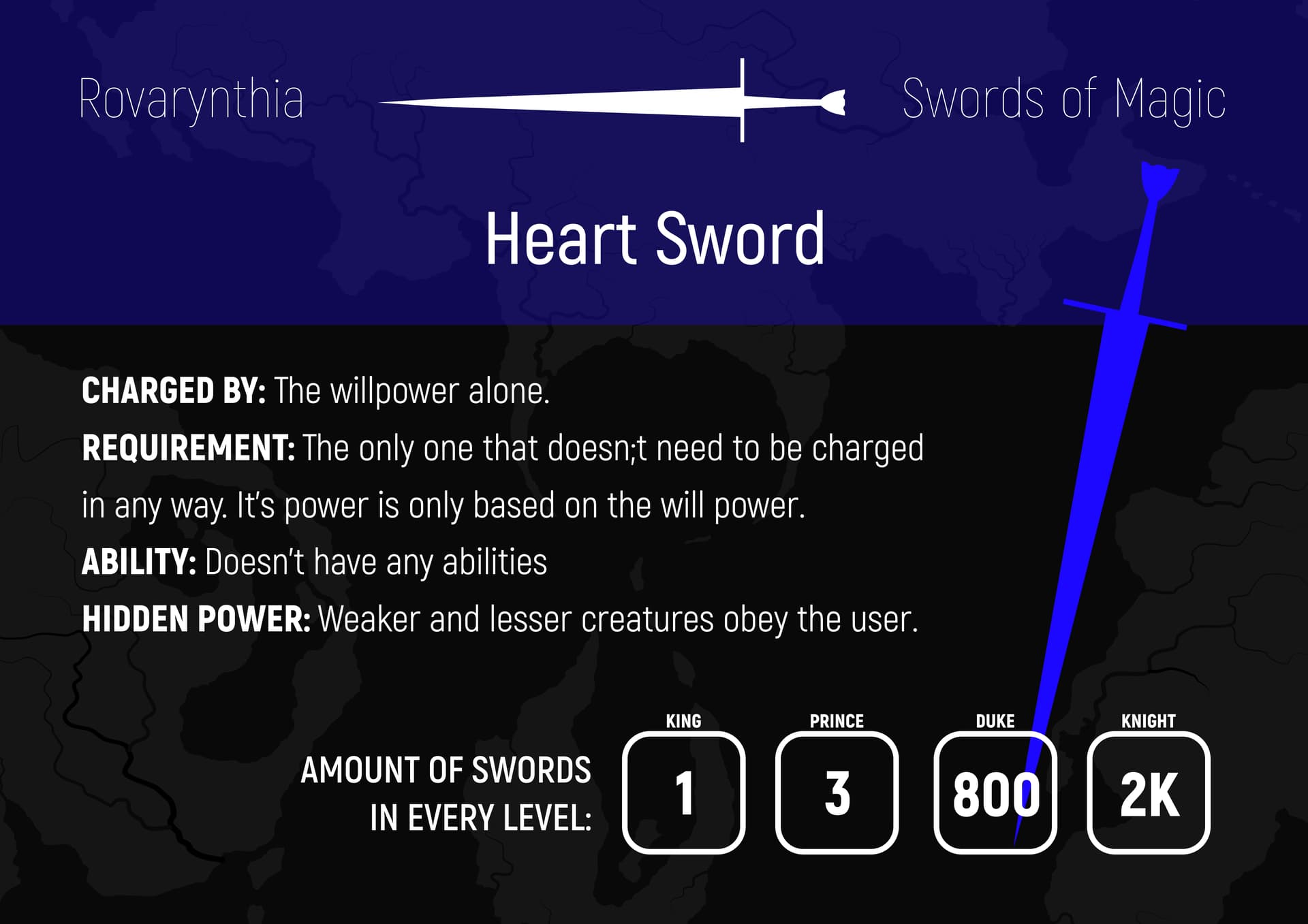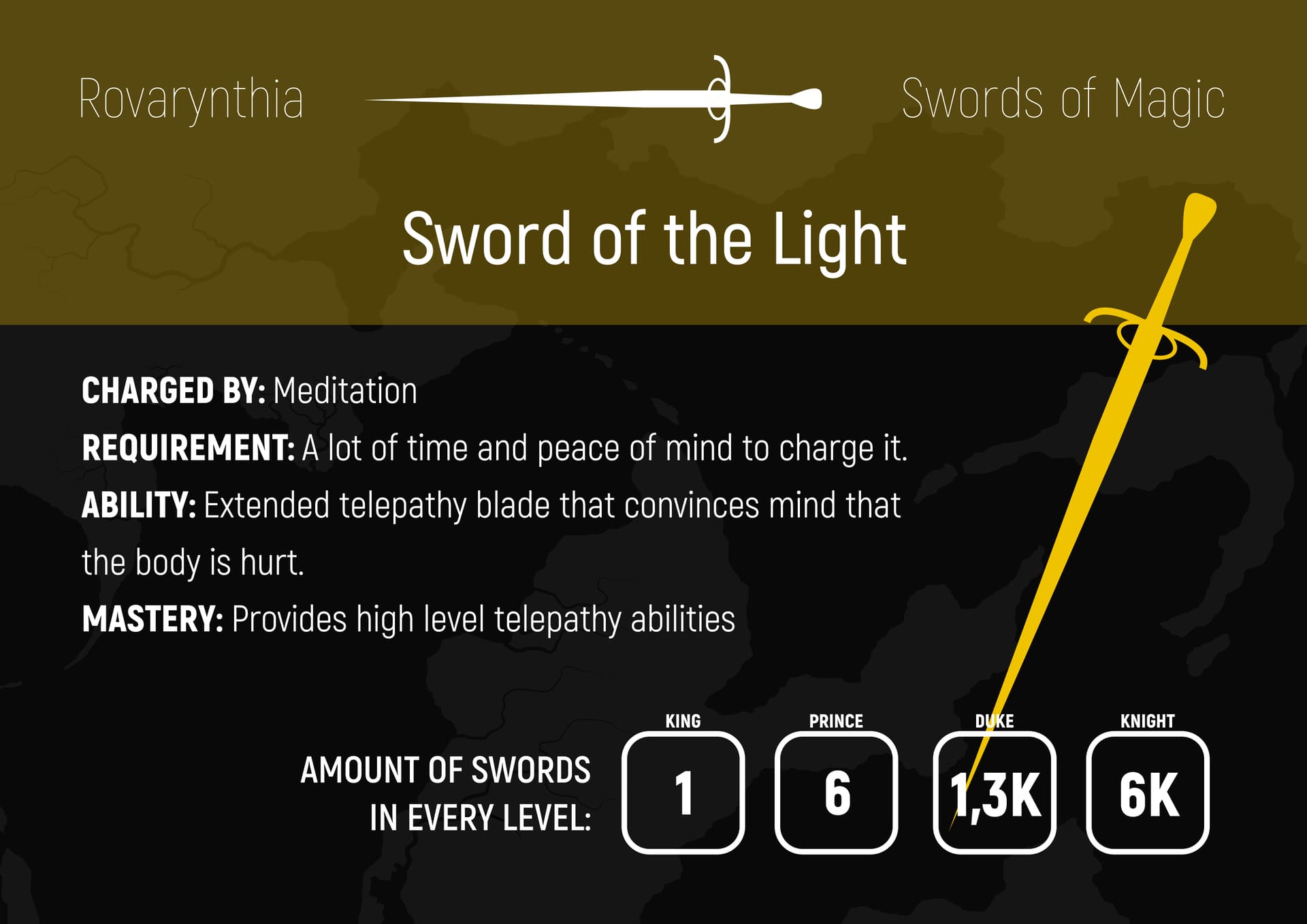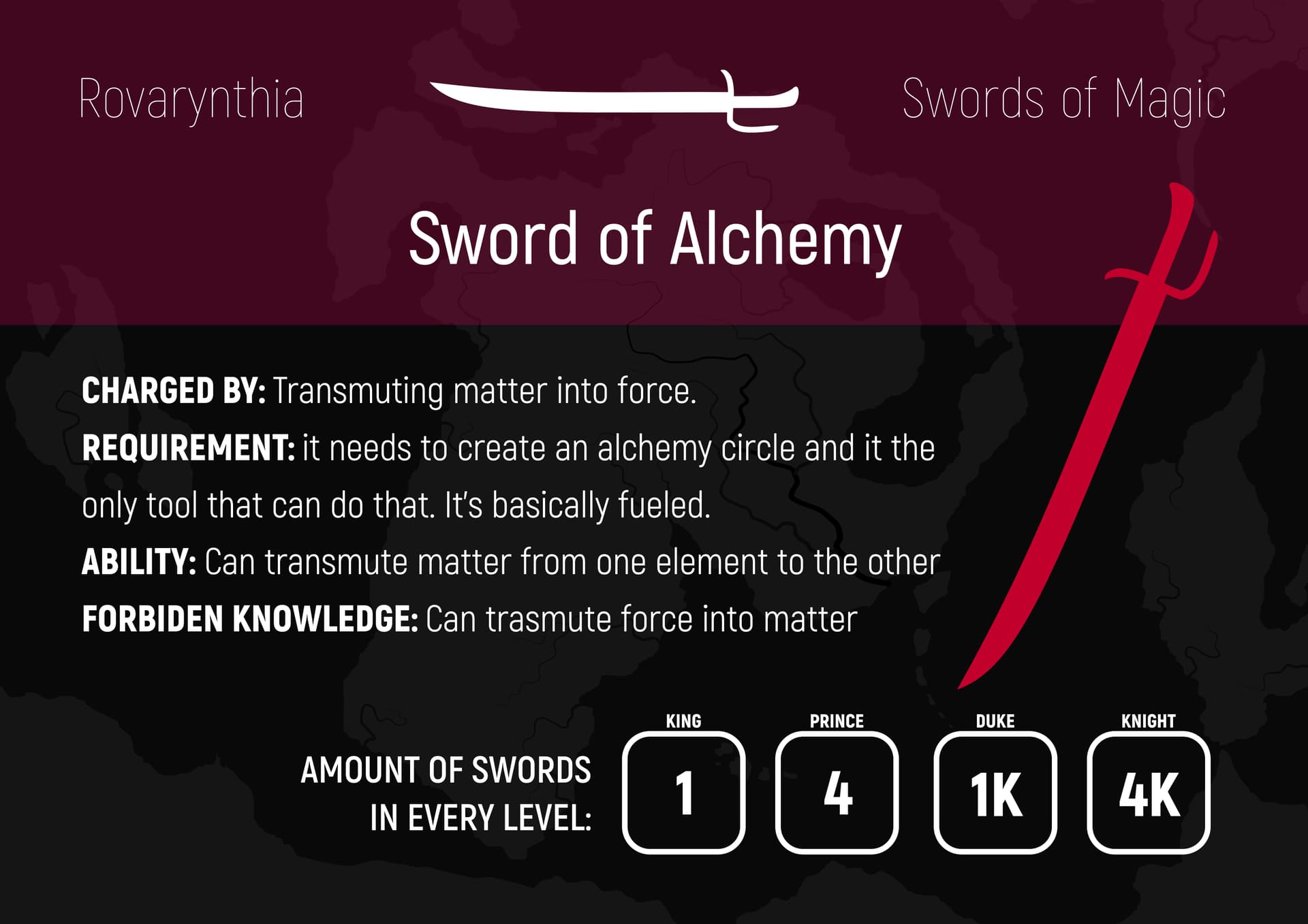 3. Magiczne miecze - pięć rodzajów a każdy ma inny rodzaj magii (np. telepatyczny miecz może wpływać na percepcję przeciwnika w trakcie walki) są inaczej ładowane (np. alchemiczny miecz trzeba po prostu karmić materią) mają inne transformacje po ich zmasterowaniu.