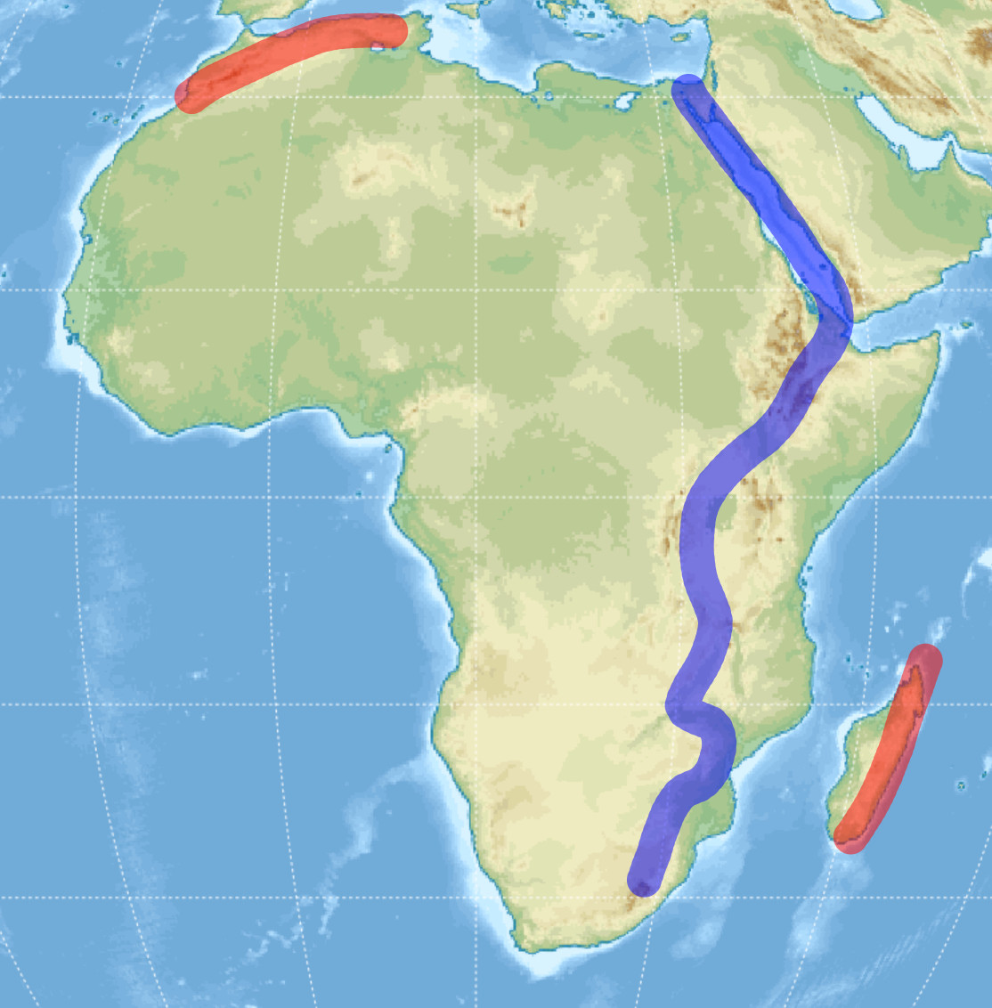 Afryka jest specyficzna. Wypełniają ją głównie równiny, płaskowyże i wyżyny, a obiegają wątłe linie niskich gór. Brakuje jej więc dynamiki w ukształtowaniu. To dlatego, że jej rzeźba zdeterminowana jest nie przez własne wypiętrzanie w strefie subdukcji, ale przez ekspansję. Dywergentna granica tektoniczna przebiega przez Morze Czerwone i Wielkie Rowy Afrykańskie, oddzielając od kontynentu Arabię, Róg Afryki, wschodnie wybrzeże i Madagaskar. Wokół Rowów znajdują się góry, pozostałości zapewne po pierwotnym zderzeniu dwóch części. Zasadniczy ruch kontynentu wiedzie na północ, tam jednak na płycie wypiętrza się jedynie Atlas i garść wysp. Reszta tej linii bowiem ulega subdukcji, zanurza się pod Morzem Śródziemnym i ustępuje w ten sposób Europie, wypiętrzając jej potężne łańcuchy. Ciekawym elementem geografii Afryki są też wszystkie wąskie cieśniny oddzielające ją od poszczególnych krain Eurazji w odległych miejscach. Choć w przypadku sztucznego Kanału Sueskiego, pierwotnie był tam specyficzny przesmyk łączący kontynenty. Zresztą miliony lat temu także Gibraltar był zamknięty, przez co Morze Śródziemne nie było wcale morzem, lecz słoną, zasuszoną krainą. Dopóki nie przyszedł potop zanklijski.