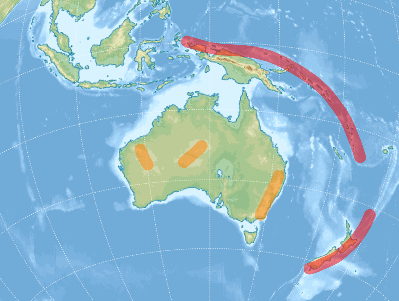 Jeśli chodzi o Australię, jej przypadek wygląda na pierwszy rzut oka podobnie do afrykańskiego, bez jednoznacznej dynamiki, z niskimi górami na krawędziach. Jednak przyjrzenie się modelom Pangei zdradza, że Australia ma swoje wyraźne, wypiętrzające się czoło. Z tym że jest ono oddzielone od kontynentu i jego płyty. To Papua i reszta Melanezji, a także Nowa Zelandia i inne wyspy na tej łamanej linii.