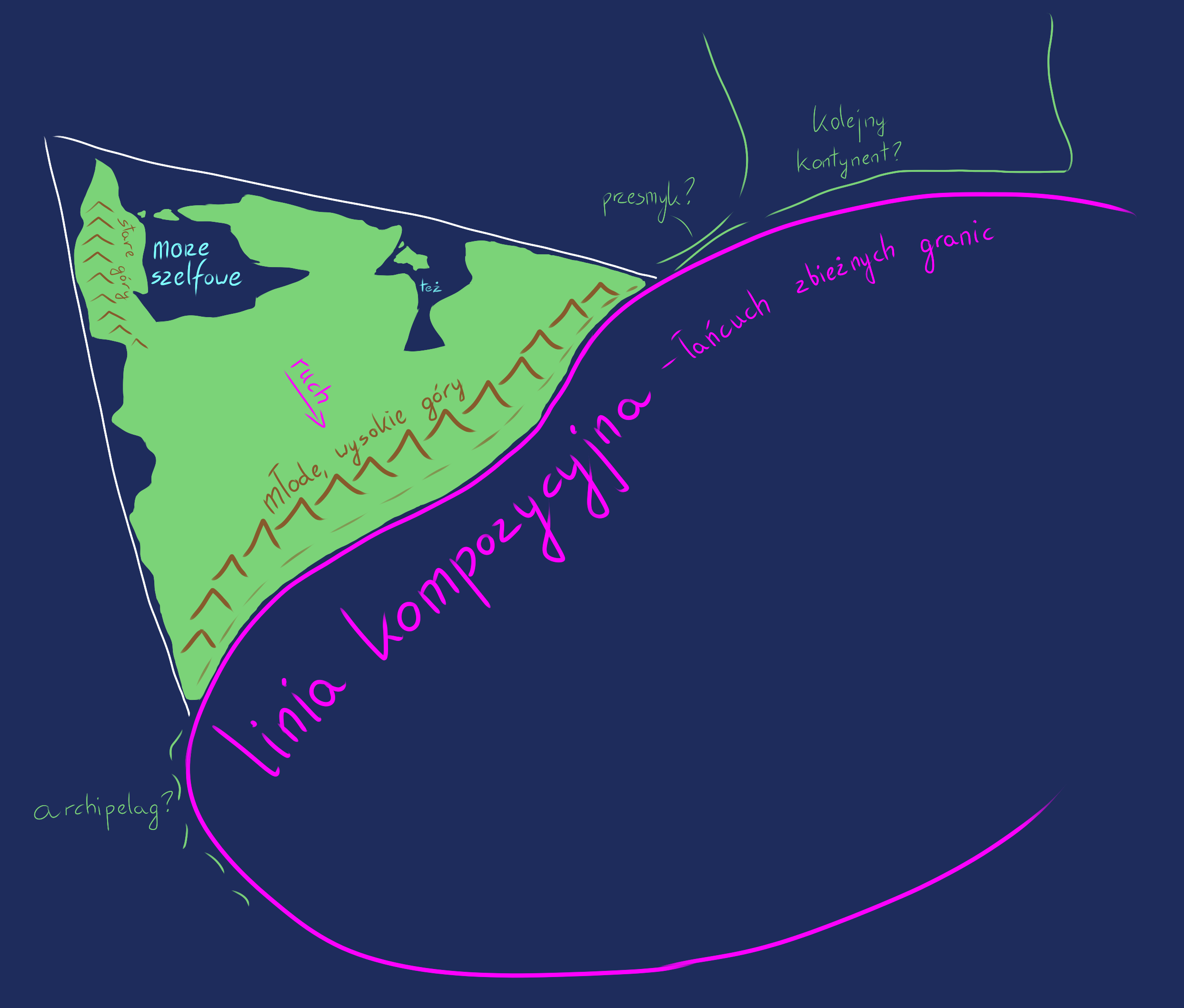 Linia kompozycyjna odpowiada łańcuchowi konwergentnych granic tektonicznych, na których zachodzi subdukcja i związane z nią piętrzenie. Wzdłuż linii układają się najważniejsze fałdy wielkich łańcuchów górskich, archipelagów i przesmyków. Linia taka jest również swoistym masztem, do którego niczym flaga przymocowany jest ląd. Wraz z oddalaniem się od tego rdzenia, ląd zwęża się, ustępując morzom i zatokom. Woda może zalać dość terenu, by wbić się cieśninami w głąb, stworzyć półwyspy, oddzielić archipelagi wysp wystających z szelfu ponad powierzchnię wody. Na ogonie kontynentu należy jednak spodziewać się znów fałdów, choć znacznie mniejszych od tych głównych. Te tylne są śladem po dawnych ruchach płyty, zgoła różnych od aktualnych, i związanych z nimi zderzeń. W mniejszej skali, lecz wrócą tu góry, półwyspy i wyspy.