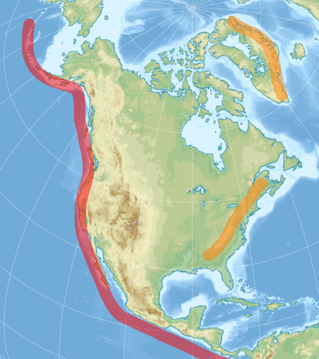 Ameryka Północna również jest zgrabna, ale ma już swoje fanaberie. Najwyższe szczyty Gór Skalistych są stosunkowo mocno schowane wgłąb kontynentu. Mają za to solidną awangardę w postaci kolejnych fałdów, fiordowych archipelagów i Półwyspu Kalifornijskiego. Utworzony przez skrajny klimat Archipelag Arktyczny i złożona tektoniczna charakterystyka Grenlandii nie ułatwiają sprawy. Również pasmo Wielkich Jezior usytuowane wśród wyżyn, a także nietypowo nizinna rzeźba podłużnego półwyspu Florydy to nietypowe, interesujące wstawki.